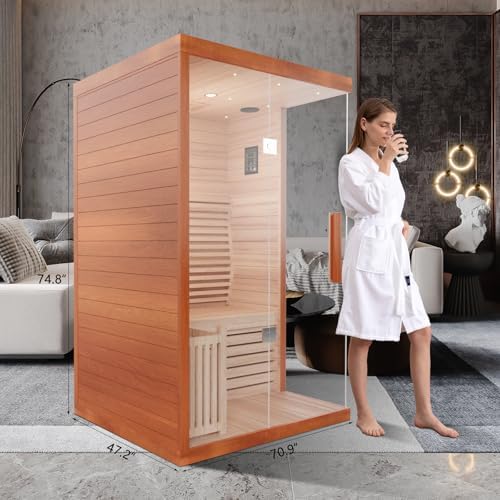 2 Person Wooden Steam Sauna Room, Red Cedar Luxurious Indoor Sona House with 6 KW Harvia Heater, Wi-Fi Controller, Bluetooth Speaker, Wooden Bucket, Scoop, Reading Light, 220V