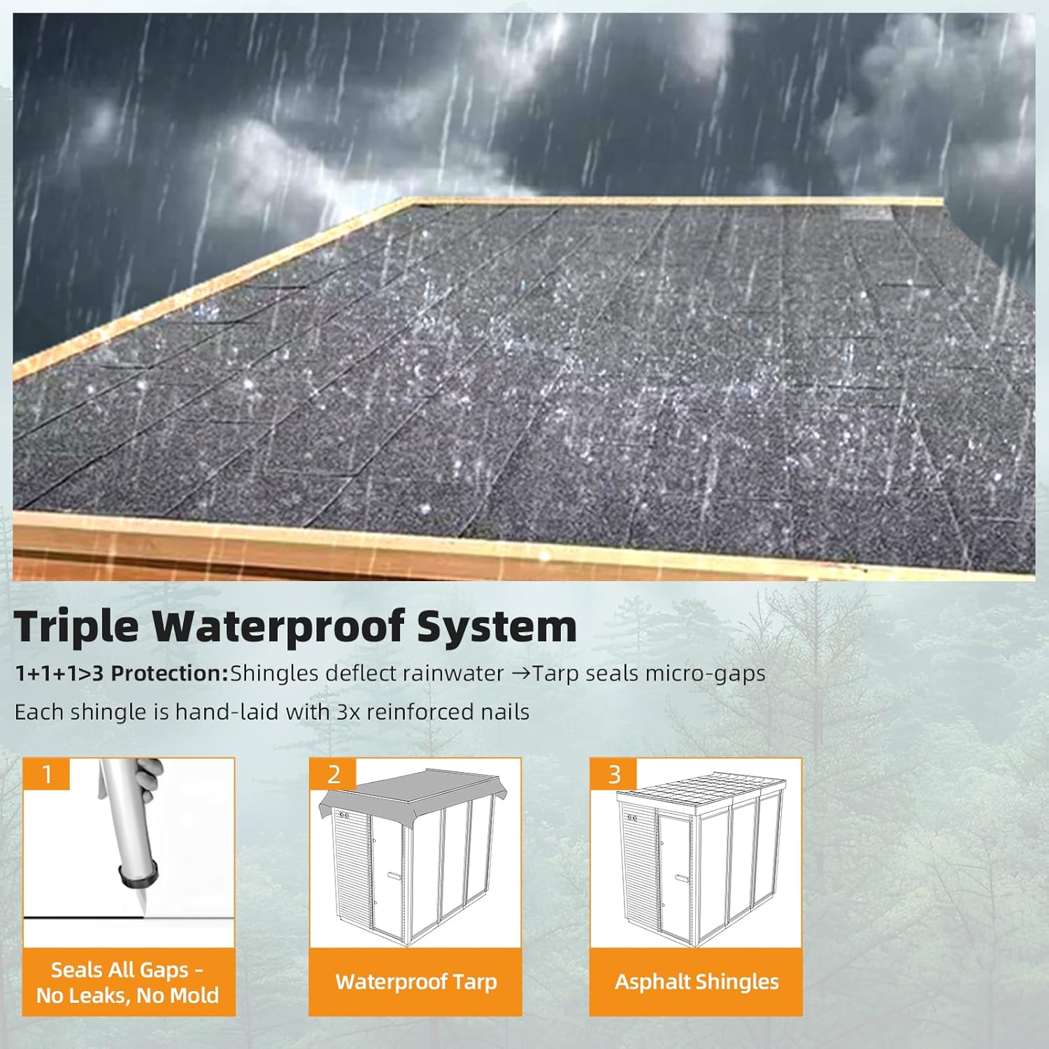 8mm tempered glass door and wooden handle, 6kW Harvia heater, volcanic stones, hourglass, hygrometer, bucket and scoop, rubber hammer, wall lamp, curved backrest, storage shelf, and waterproof roof system.